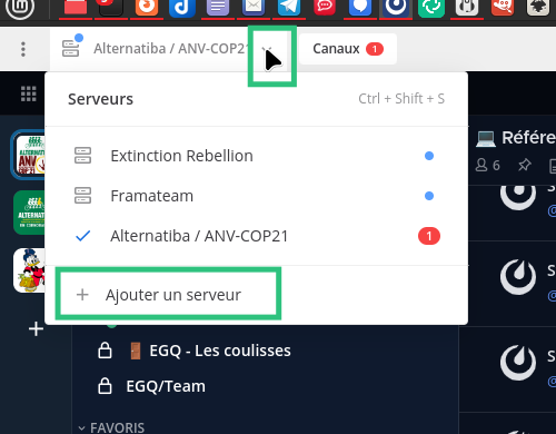 2. Si jamais tu utilises déjà Mattermost avec d'autres collectifs (XR ou sur une équipe Framateam par exemple), tu peux ajouter un nouveau serveur dans l'application pour pouvoir naviguer de l'un à l'autre très facilement depuis la même application. Pour ajouter le nouveau serveur, clique sur la flèche en haut à gauche près du nom du serveur que tu utilises déjà :