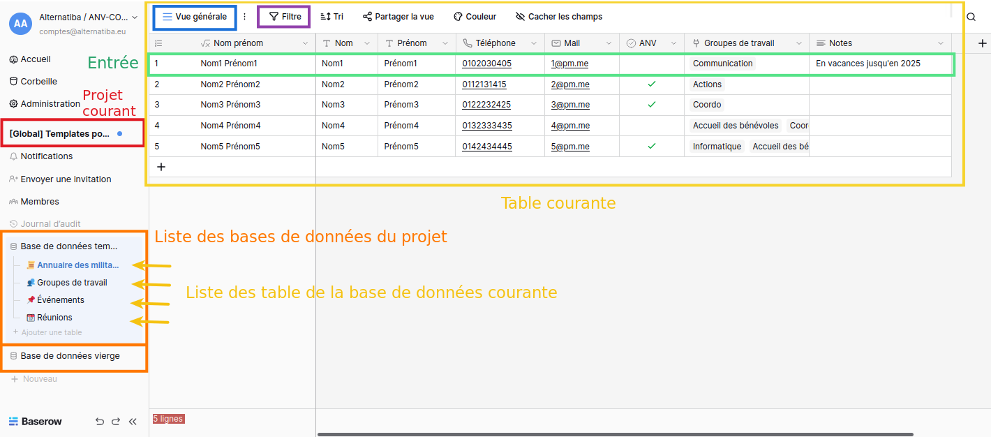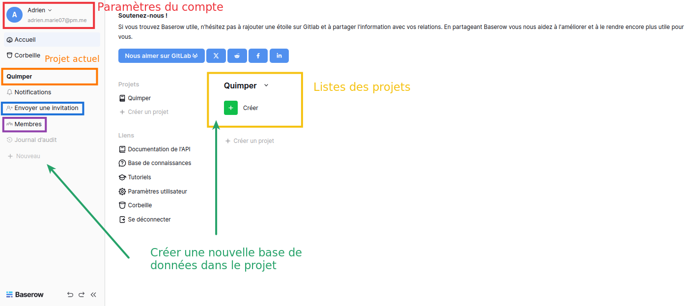 • des liens vers des ressources utiles (tutos Baserow, documentation Baserow, forum Baserow, etc.)