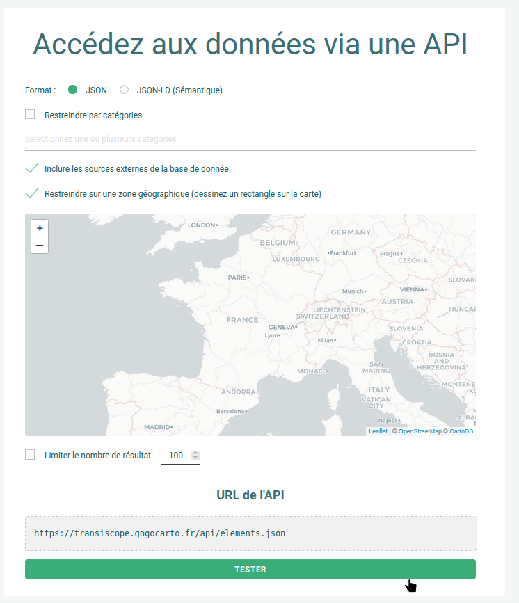 En plus de la visualisation cartographique, Transiscope est également doté d'une fonctionnalité permettant de récupérer les points de la carte sous un format qui permet d'exploiter facilement les données pour s'en servir. Cette fonctionnalité fait appel à une API et permet de sélectionner différents critères pour définir quels points on souhaite récupérer (zone géographique, catégories, nombre max, etc.).