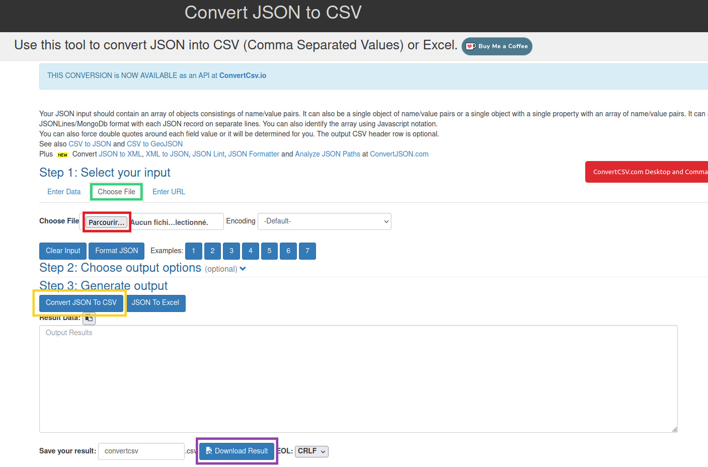 1. Se rendre sur https://www.convertcsv.com/json-to-csv.htm.